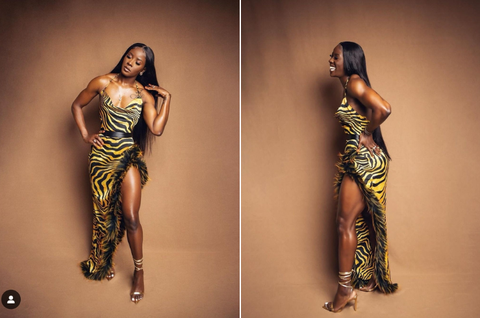 In a post shared on her social media platforms, the world's fastest woman alive in the 200m event shared beautiful pictures wearing a zebra stripped print fuzzy trim dress by SHEIN.