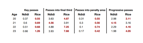 However, while Rice’s repertoire continued to swell in the cauldron of the Premier League, so much so that utilising him deep in midfield is now seen as limiting his output, Ndidi never quite kicked on in the same way. Concerns over the Nigeria international’s ability on the ball have always been there, but tracking both players’ metrics at the same age reveals an unmissable pattern: while Rice clearly got better and more expressive in possession, Ndidi’s work largely remained the same.