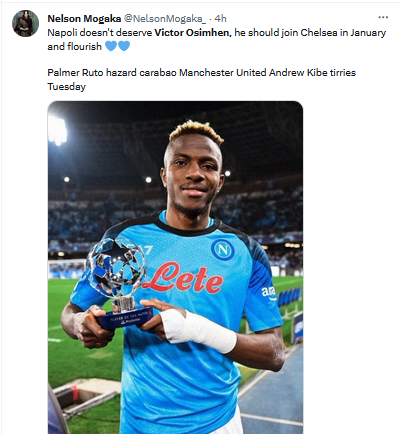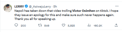 One @Esther_Rapheal1 said “Napoli don’t deserve our king, Victor Osimhen come to Chelsea and play in best club in London, you once have the dream,” while influencer @_AsiwajuLerry said “Dear @sscnapoli, your admin is on TikTok trolling your own Player, Victor Osimhen for missing a Penalty. Is this how you repay a Player who fought hard on the field to end your 33 years of waiting for a League title??”