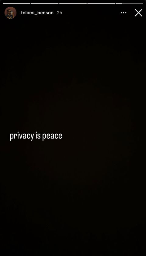 Benson concluded the sequence with a plain black background bearing the words “privacy is peace,” signaling her desire to step away from the scrutiny.