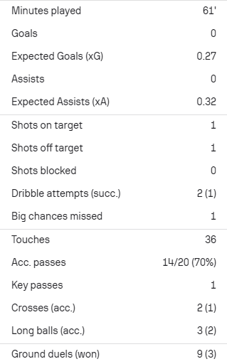 He only won three out of nine ground duels and won his only aerial duel but lost possession of the ball 12 times.