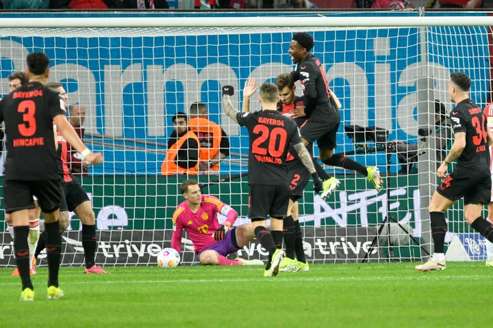 Nathan Tella and Leverkusen celebrate a big win against Bayern Munich last time. (Photo Credit: Bundesliga)