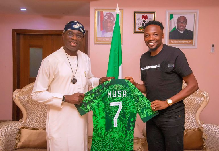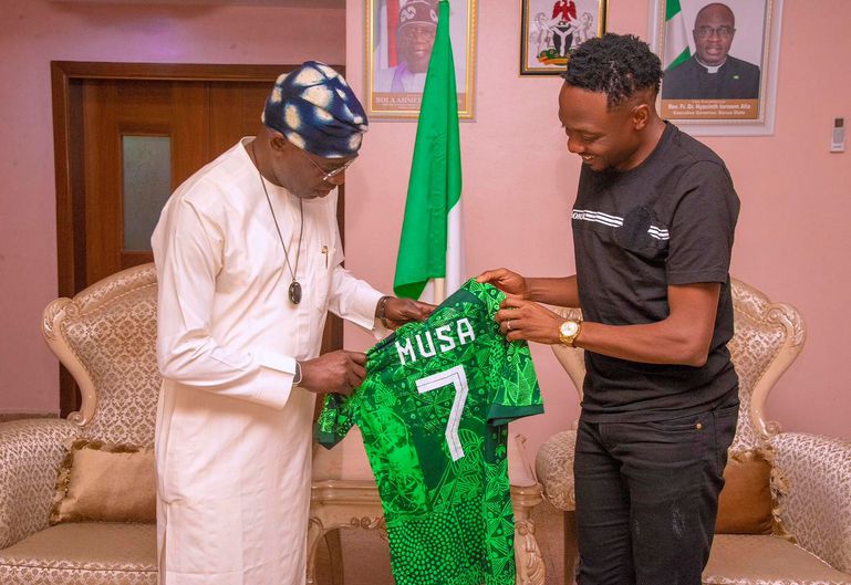 He gifted the governor his Super Eagles jersey with the name Musa and the number seven.
