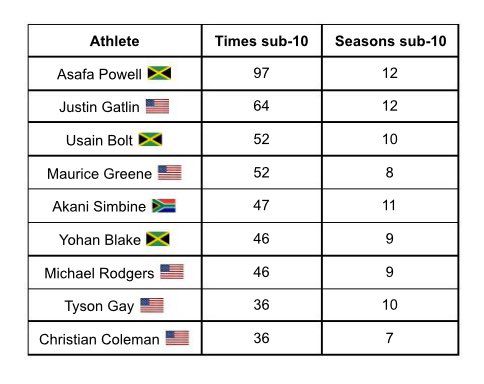 A recent stat shows the most sub-10s times and consistency in seasons, saturated by Jamaican American sprinters. Simbine sits fifth at 47 times behind Powell (97), Gatlin (64), Bolt (52), and Greene (52).
