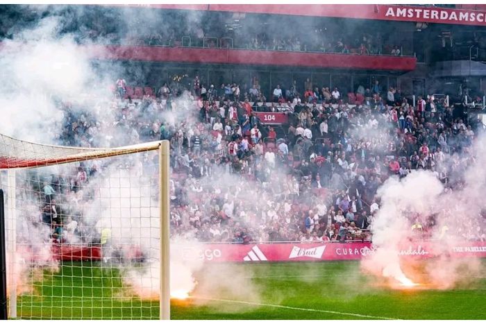 Feyenoord were leading 3-0 before the game was suspended after fans of the home side, Ajax, threw flares and fireworks onto the pitch at the Johan Cruyff Arena.