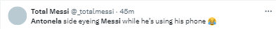 Antonela shot a sideways glance at Messi's phone, which seemed to be a casual glimpse.