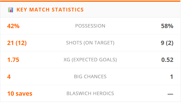 Leverkusen had 58% of the ball, Arsenal had 42%. And yet Arsenal created four big chances to Leverkusen's one, put 12 shots on target to their two, and posted an xG of 1.75 against 0.52.
