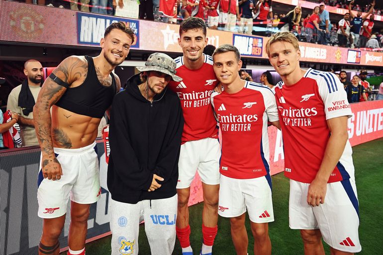 Justin Bieber, a Canadian pop star, watched the Gunners play United at the SoFi Stadium.