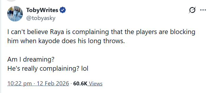 “I can’t believe Raya is complaining that the players are blocking him when Kayode does his long throws. Am I dreaming? He’s really complaining?” one fan wrote on social media.