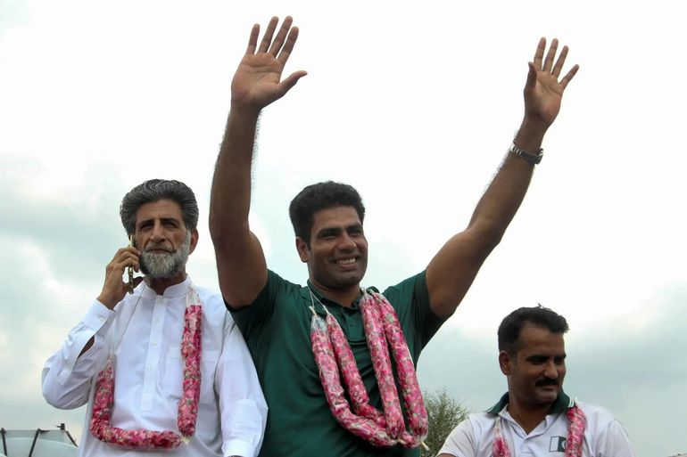 On his return, thousands of supporters showed up at the airport for their hero, who once trained with javelins he fashioned out of eucalyptus branches. According to Reuters, he was greeted in Lahore with a water cannon salute and was adorned with garlands.