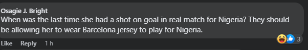 “They should be allowing her wear Barcelona jersey to play for Nigeria,” he posited further.