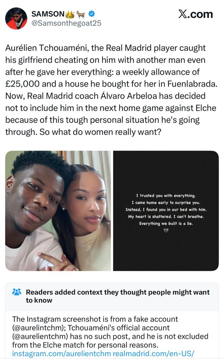 The now-deleted post claimed that despite providing her with a lavish £25,000 weekly allowance and purchasing a house for her in Fuenlabrada, Spain, Tchouaméni was betrayed, leading to his exclusion from Real Madrid's upcoming home match against Elche by coach Álvaro Arbeloa due to the "tough personal situation".