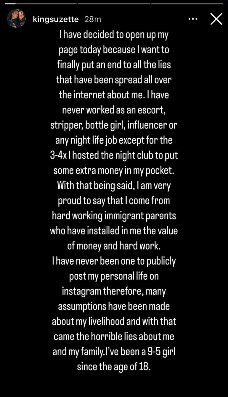 Carter explained that she had worked traditional jobs since her teenage years and said she was proud of her upbringing. “I have never worked as an escort, stripper, bottle girl, influencer or any nightlife job except for the 3–4 times I hosted a nightclub to put some extra money in my pocket,” she said, adding that she had been a “9-5 girl since the age of 18.”