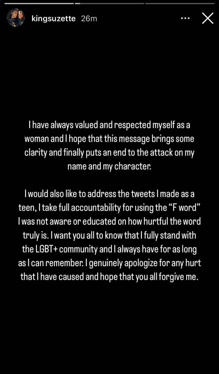 “I take full accountability for using that word,” she wrote. “I was not aware or educated on how hurtful it truly is. I genuinely apologize for any hurt that I have caused and hope that you all forgive.”