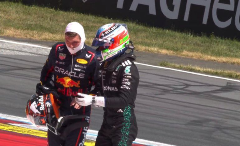 Verstappen, understandably furious, was seen debriefing with the young Mercedes driver post-crash.