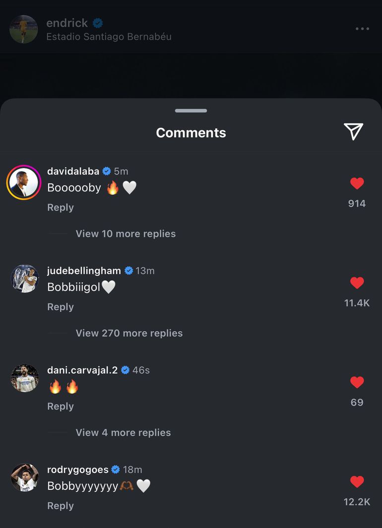 First team stars including Vinicus Junior, Jude Bellingham, David Alaba, and Rodrygo Goes all left messages of support for Endrick, but they all called him “Bobby”, an apparent nickname for their new teammate.