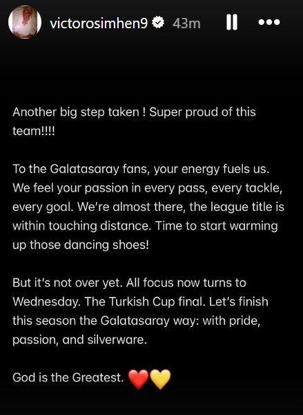 Osimhen also shifted focus to the upcoming Turkish Cup final, adding, “It’s not over yet. All focus now turns to Wednesday. Let’s finish this season the Galatasaray way: with pride, passion, and silverware. God is the Greatest.”