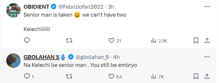 Boniface replied, “From today, call me senior man,” triggering responses from fans who were quick to remind him that the tag already belonged to another Super Eagles forward, Kelechi Iheanacho.