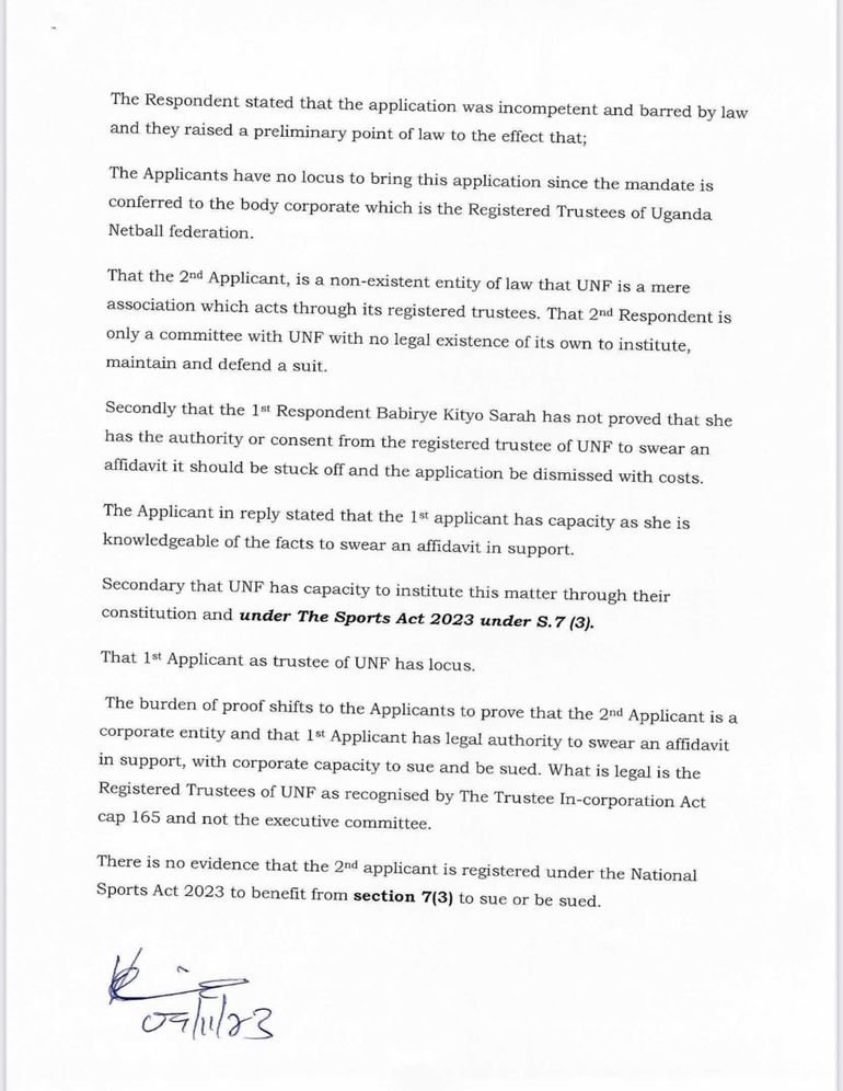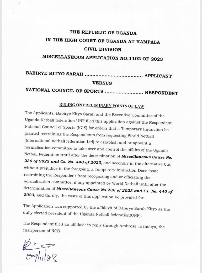 The letter signed by registrar Kintu Simon Zirintunsa said: "The Applicants, Babirye Kityo Sarah and the Executive Committee of the Uganda Netball Federation UNF filed this application against the Respondent National Council of Sports (NCS)…”