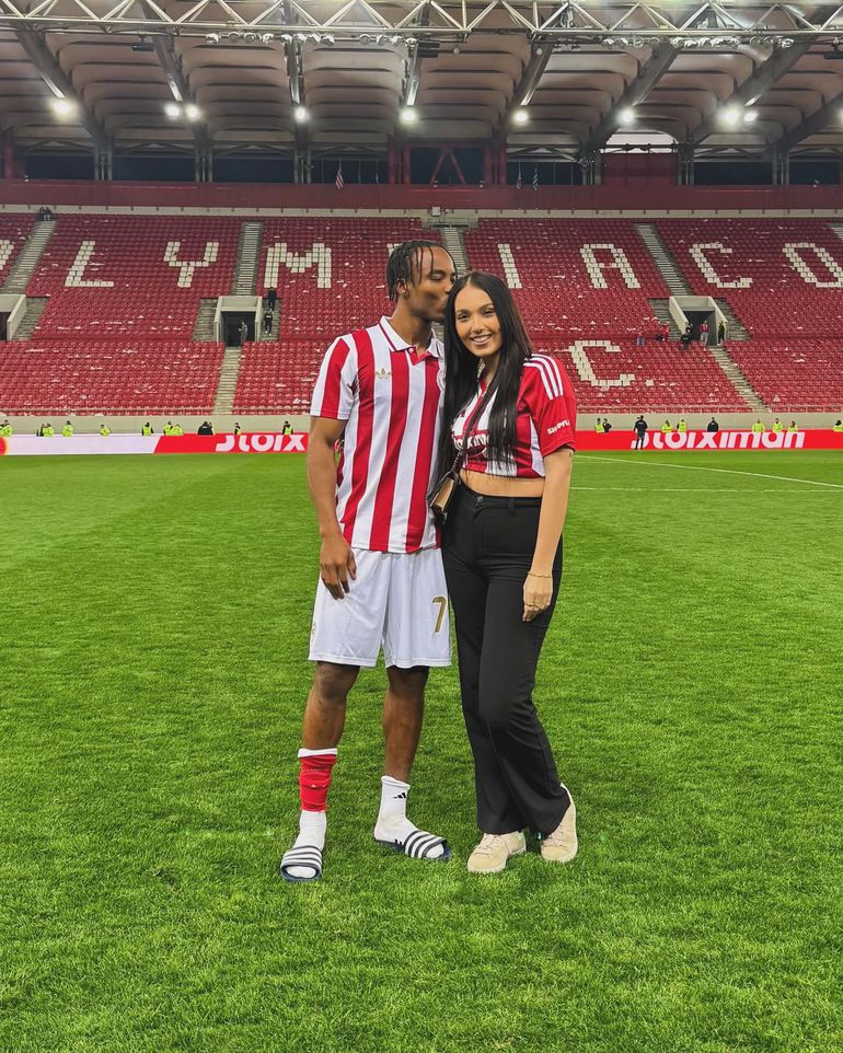 In the photos, Fontes showers Onyemaechi with kisses as they posed wearing an Olympiacos outfit.