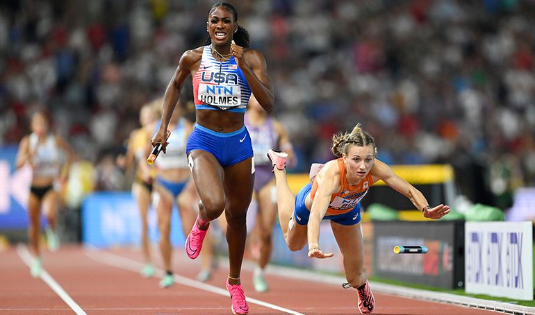 Alexis Holmes of the USA ran a fantastic anchor leg, and her pressure on Netherlands track star Femke Bol in the last 50m paid off, as the Dutch speedster lost her footing and fell to the ground, handing USA the historic win.