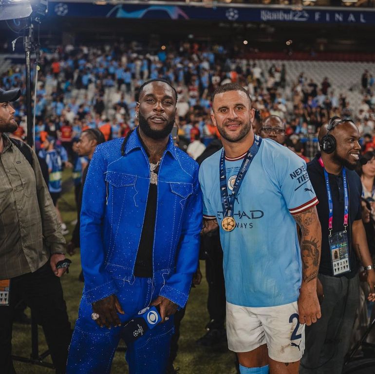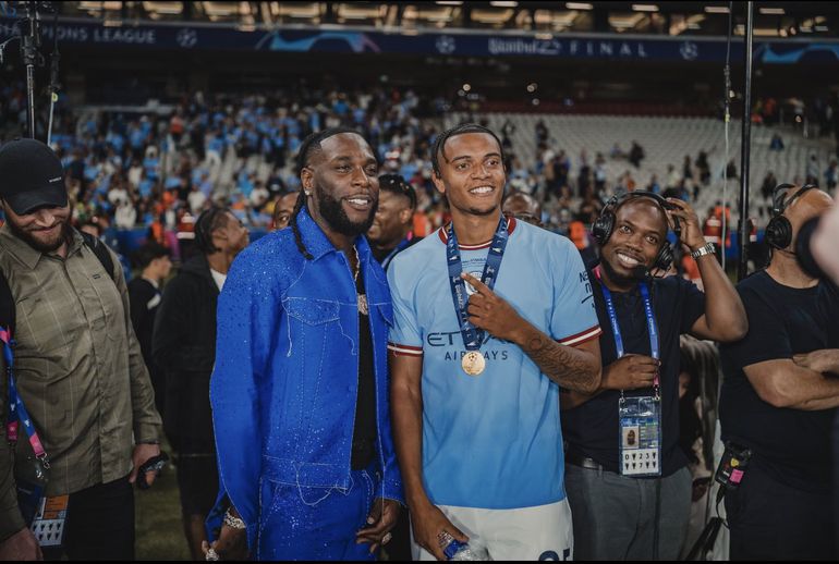 Amid Manchester City's Champions League title celebrations, Burna Boy also posed for pictures with some of City's treble-winning squad members.