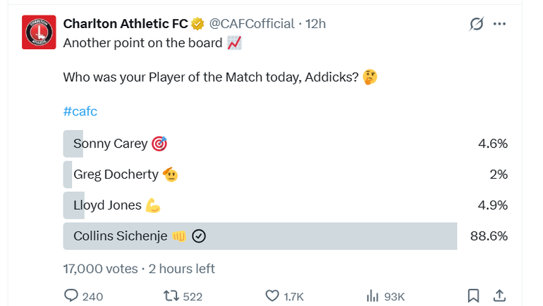 In an online vote which the club conducted on who should be crowned Man of the Match, Charlton had goal scorer Sonny Carey, midfielder Greg Docherty, defender Lloyd Jones and Sichenje but by Sunday morning, the Kenyan had nearly 90 per cent of the vote.