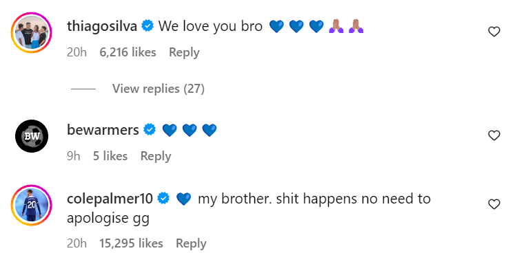 Cole Palmer, Malo Gusto, and Enzo Fernandez, among others, took to Instagram to express their support for Sterling. Palmer's reassurance, 'My brother. Shit happens, no need to apologise, gg', encapsulates the team's understanding and camaraderie during challenging times.