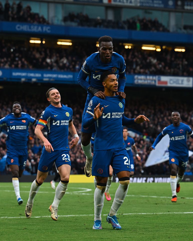 Gallagher celebrates Colwill's goal during the game against Brighton. (Photo Credit: Chelsea/X)