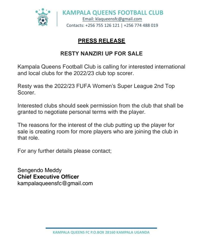 "Kampala Queens Football Club is calling for interested international and local clubs for the 2022/23 club top scorer," partly reads the release signed by CEO Meddy Ssengendo.