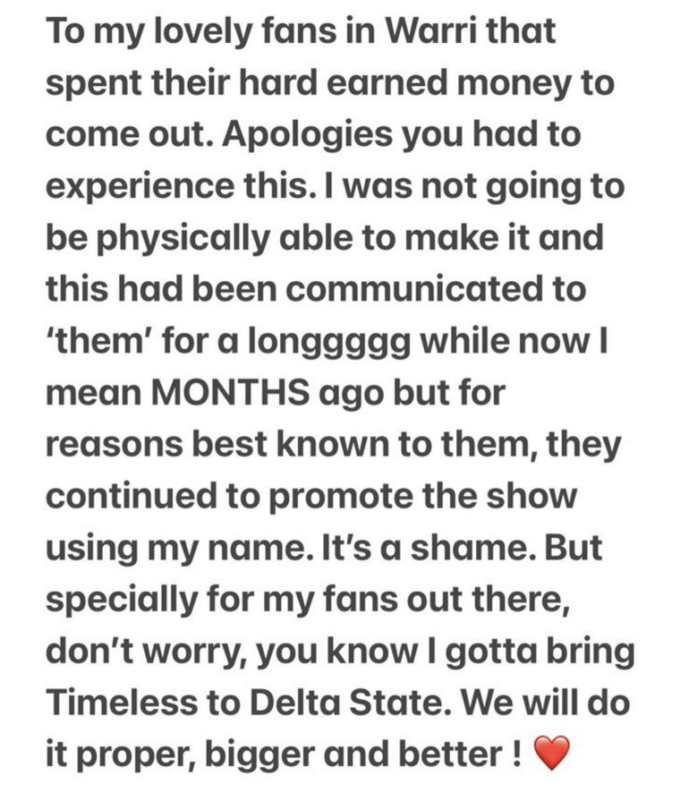 The statement by Davido were, "NOBODY CAN STOP ME FROM PERFORMING-ANYWHERE IN NIGERIA … WARRI I WILL SEE YOU SOON . ❤️
