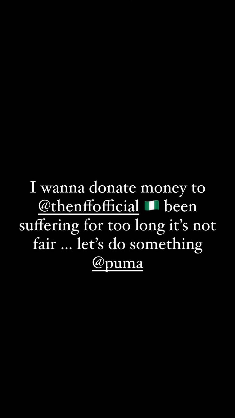 “I wanna donate the money to @thenffofficial…been suffering for too long, it’s not fair…let’s do something @puma.”