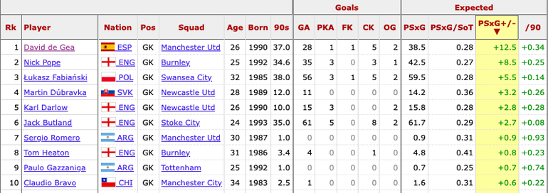 The 2017-18 campaign was arguably the goalkeeper’s finest at Old Trafford. It was evident in the eye test, and the advanced analytics verified the 32-year-old’s impressive shot-stopping as Jose Mourinho’s Red Devils ended second.