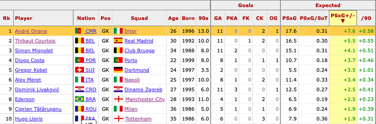 No shot-stopper prevented more goals than the Inter goalkeeper, with Real Madrid’s Thibaut Courtois coming second among players to have averaged six games or higher.
