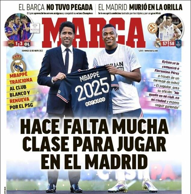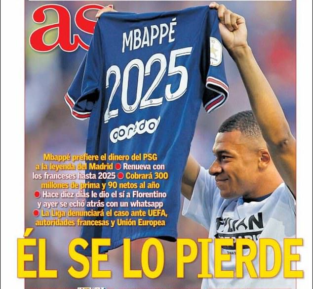 Per Daily Mail, an excerpt from the article read: 'Mbappe prefers PSG's money to Madrid's legend.'