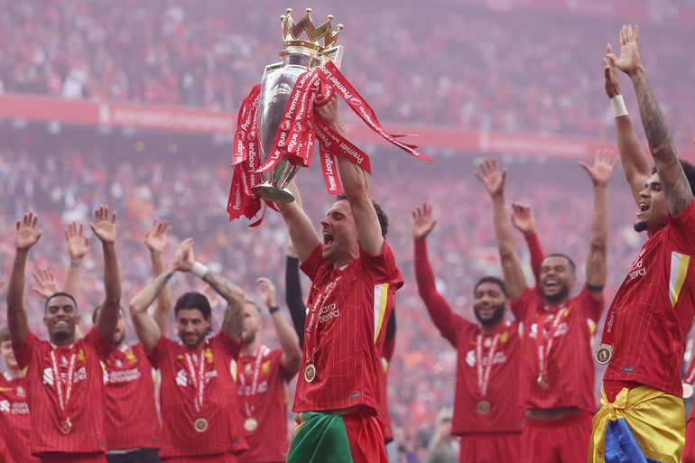 Jota joyfully lifting the Premier League trophy with Liverpool