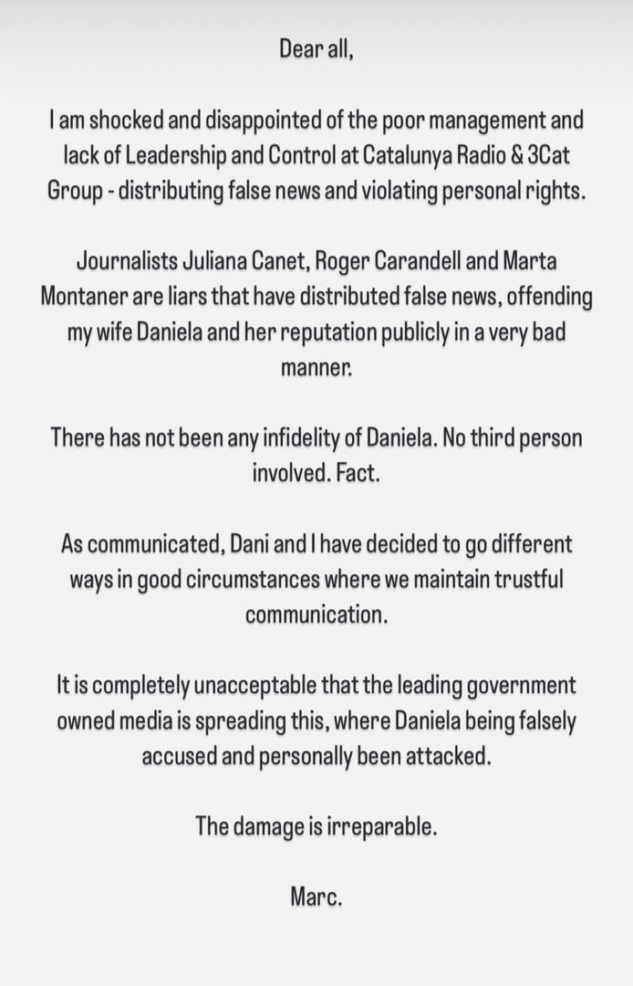 “Juliana Canet, Roger Carandell, and Marta Montaner are liars that have distributed false news, offending my wife Daniela and her reputation publicly in a very bad manner.”