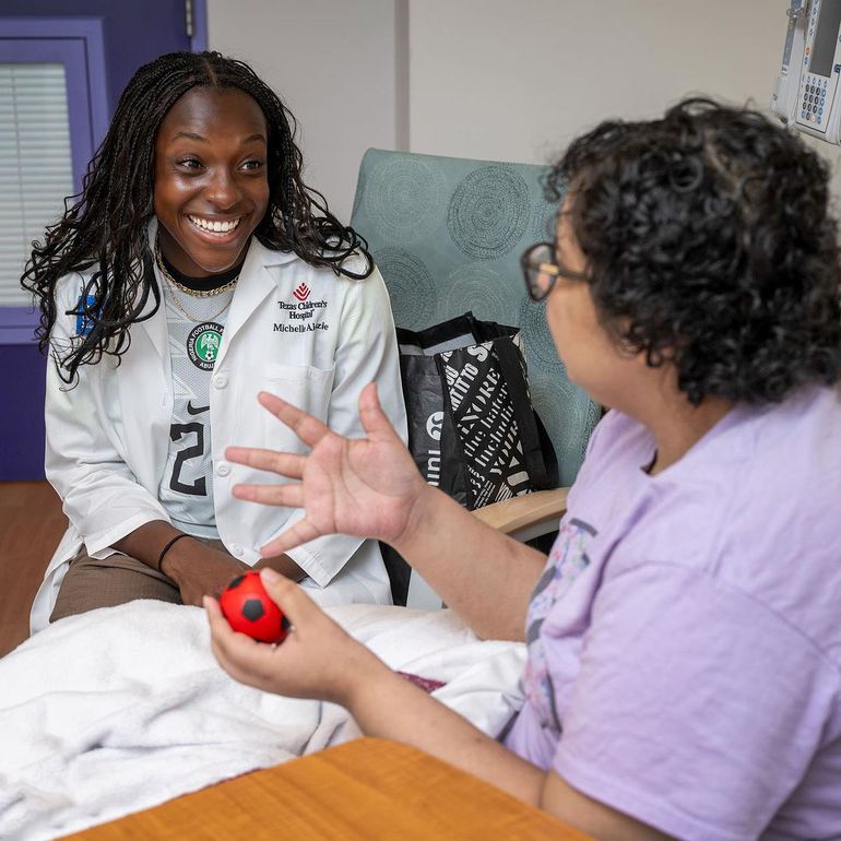 Doctor Michelle Alozie returns to Texas Children's Cancer Center: Super Falcons star smiles with patients