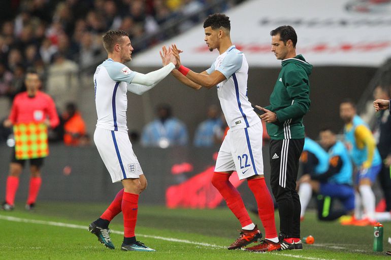 Dominic Solanke came off the bench to replace Jamie Vardy for his England debut in 2017 against Brazil (IMAGO)
