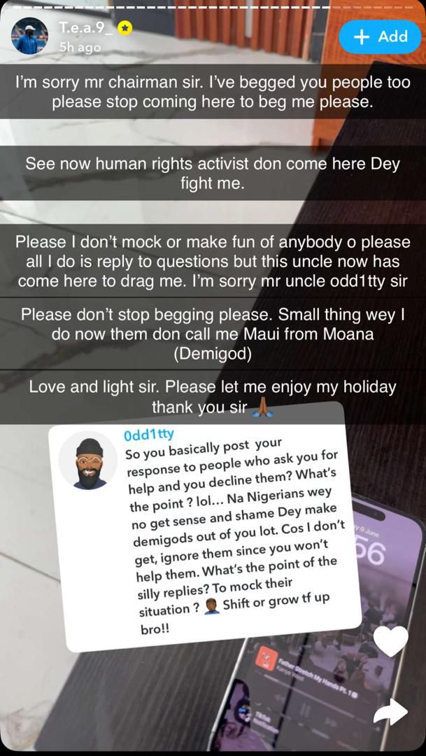 “Small thing wey I do now them don call me Maui from Moana (Demigod). Love and light sir. Please let me enjoy my holiday thank you sir.”