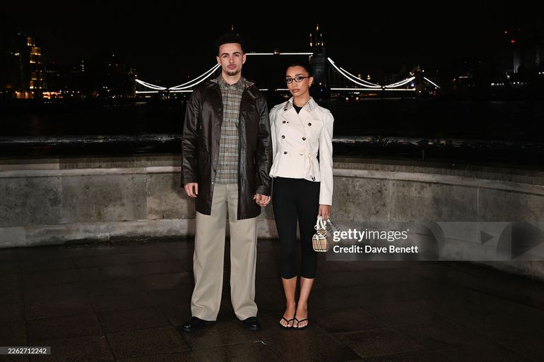 Liverpool's Curtis Jones chose a leather overcoat atop a shirt with Burberry's signature check pattern, flanked by his beautiful fiancée Saffie Khan, who sported a cropped trench coat.