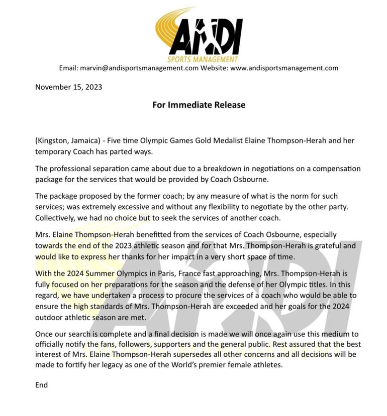 The management affirmed in the release that Thompson-Herah benefitted greatly from the services of coach Osbourne, and for that, she would like to express her thanks for the impact in a short time. But they would be searching for a new coach with the Paris 2024 Olympic Games fast approaching.