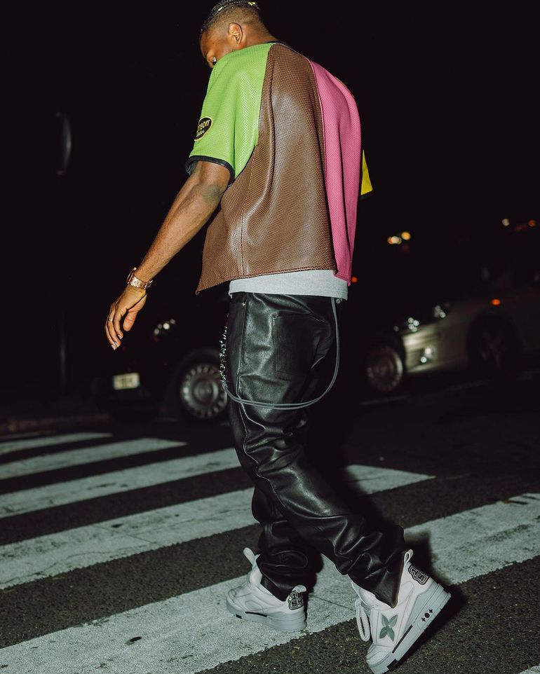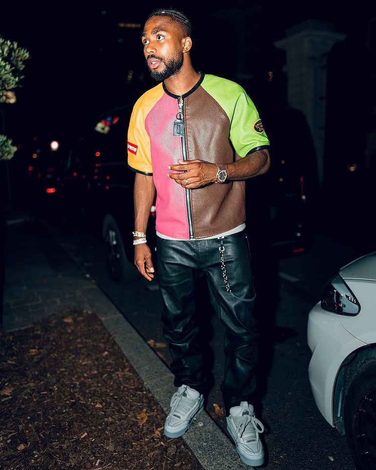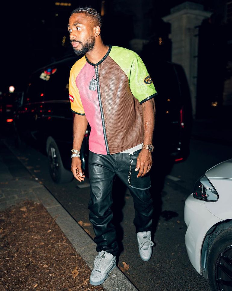Dennis stunned in a Street Style Collaboration Leather Logo Biker Jacket off the Supreme Spring/Summer 2023 Collection worth over N5 million (€6,821) on black leather pants, and a Louis Vuitton Skate Trainer estimated to cost more than N1.5 million ($1,688).