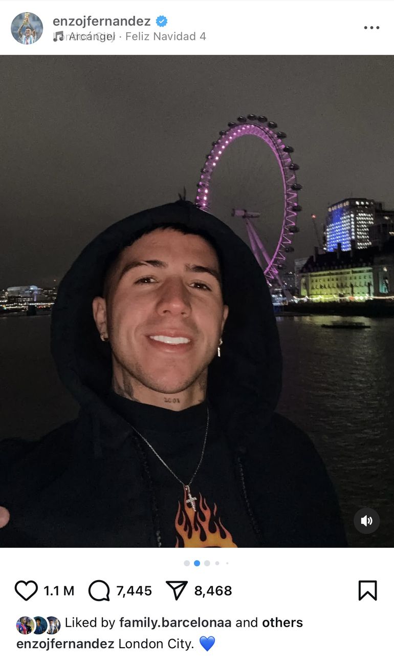 Dressed to impress and oozing confidence, Enzo captioned his post with a simple “London City” and a blue heart emoji, quickly igniting speculation about who might be behind the camera.