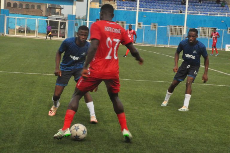 Five-star striker Antoine Desouza takes on a Miracle defender. (Photo Credit: Abia Warriors/X)