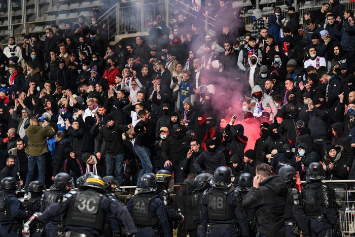 The game on Friday was stopped at half-time after fans fled onto the field as flares and smoke bombs were thrown around and fighting broke out in the stands at the Charlety stadium in Paris.