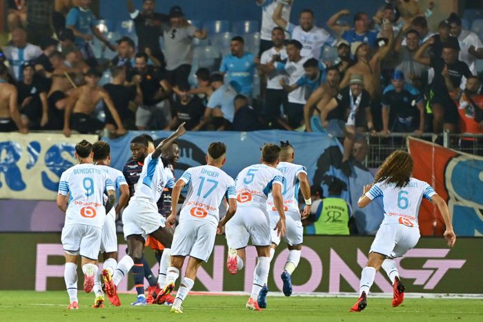 Marseille came back from two goals down to win 3-2 at Montpellier in their French Ligue 1 opener on Sunday but the game was held up when fans pelted the pitch with bottles.