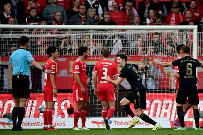 Bayern Munich striker Robert Lewandowski (C) celebrates after scoring from a free-kick at Union Berlin on Saturday