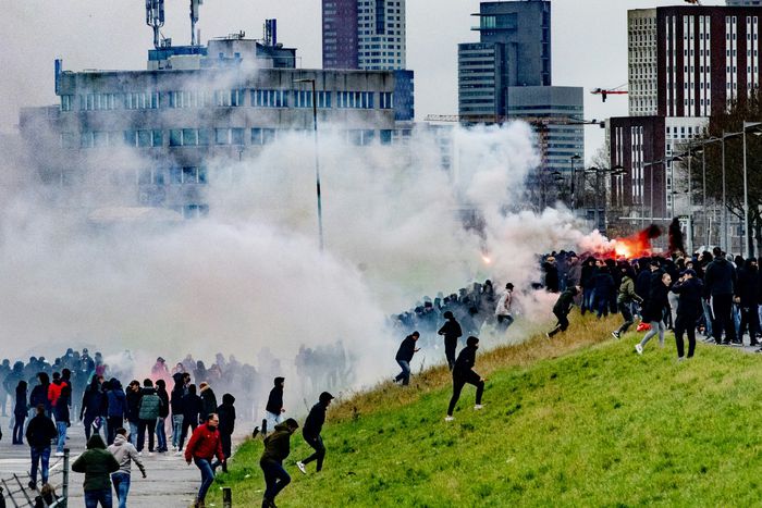 According to the Dutch news agency ANP, a group of 100 to 150 people threw smoke bombs and bottles at the police.