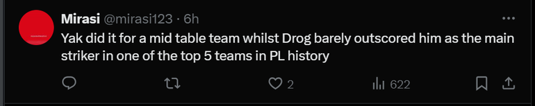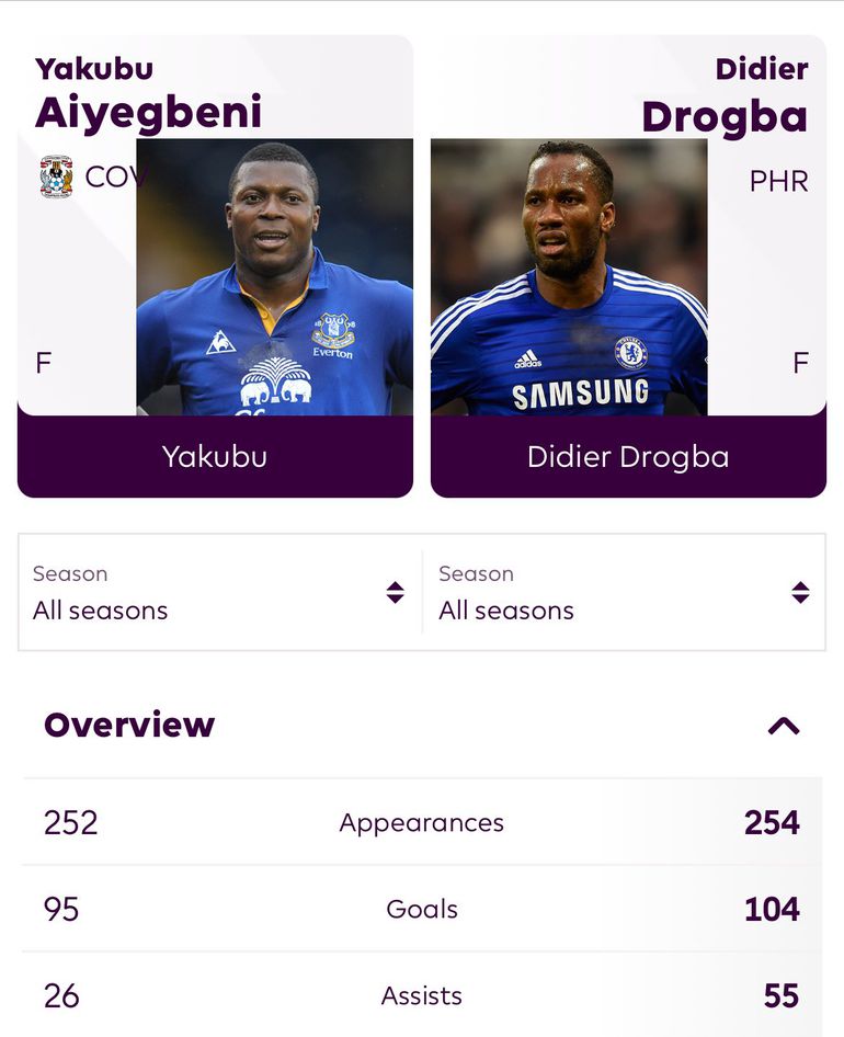 The post featured a screenshot from the Premier League website's player comparison feature, and displayed Drogba and Yakubu’s total Premier League appearances, goals and assists.